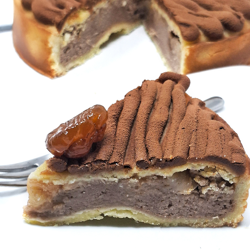 L’impasto, morbido e profumato, è arricchito da pezzi di castagna che regalano una piacevole nota rustica, mentre la ganache alla castagna ricopre il tutto in una crema setosa e golosa. Una torta che scalda il cuore e celebra i sapori autentici della stagione.